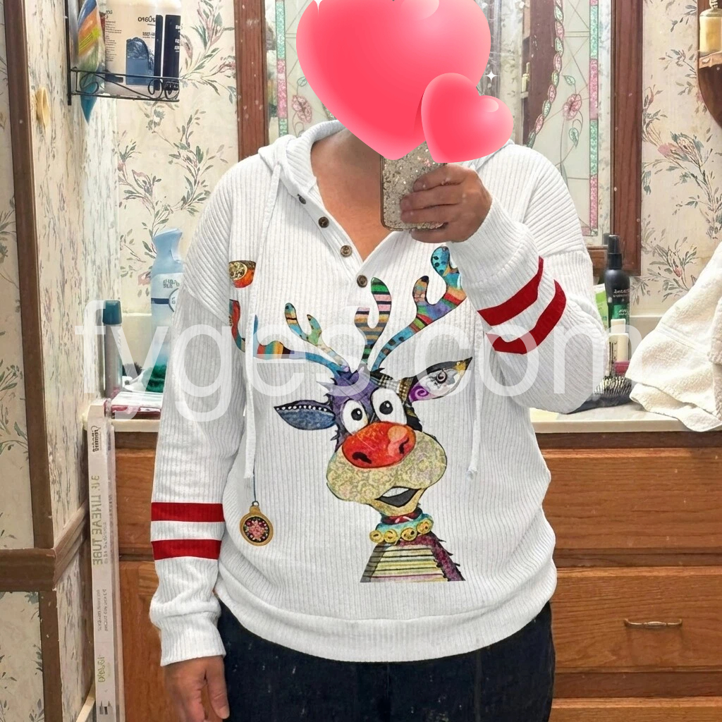 Bring in the winter season with this holiday-ready reindeer top. A white cozy ribbed top with red stripes and colorful reindeer print make this hoodie a cheerful complement to your day or night with its relaxed vibe. A plunging v-neck and buttons on the front give it the perfect amount of detail and chic fit.